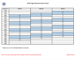 Visit the AYSO Age Guide chart for the current Membership Year chart.