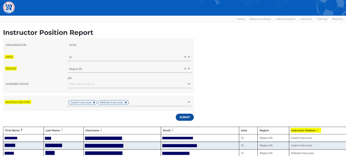 In the drop-down, you can select either Area or Region, or both. In the drop-down for the Instructor Type, you can choose the Instructor position you are searching for and click Submit.
