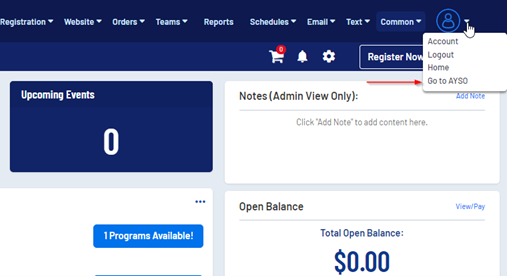 Sports Connect screenshot of Go to AYSO button