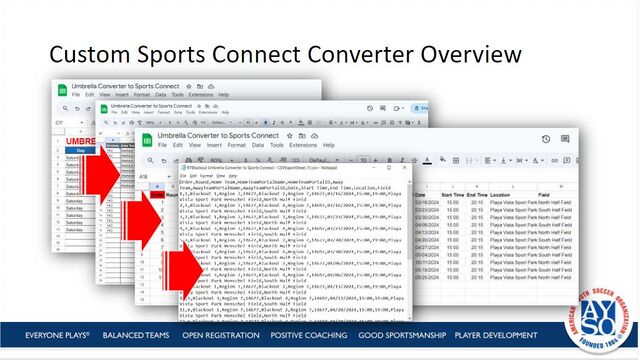 Four-stage process of converting a general schedule from a basic chart to a useful CSV file for Sports Connect import.