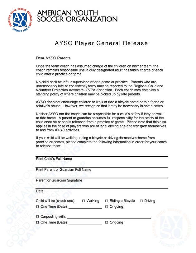 If a child will be walking, riding a bicycle, ridesharing, or driving themselves home from practice or games, parents/guardians MUST COMPLETE an AYSO Player General Release Form in order for the coach to release them.