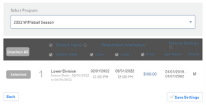 3. Use the drop-down menu to select a Program, then "Select" the Division's you'll like to display. You'll also see the option to display Season Dates, Registration Open/Close Dates, and the Price.