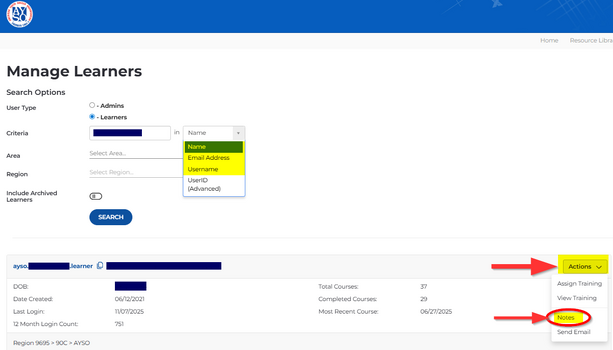- You can search for the Learner by the following and click on Notes:
