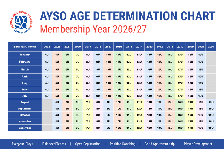 Beginning with the 2026/2027 season AYSO and other youth soccer organizations are changing to a more school year like age division system. Following extensive review and discussion, AYSO, US Youth Soccer, and US Club Soccer have collectively decided to move to an age group player formation cycle that runs from August 1 to July 31, starting with Membership Year 26, the 2026-27 season/registration year. This change was made based on additional critical feedback, data, and expert input to better align players with their school-grade peers. AYSO feels that this age group player formation will be the most inclusive and help increase participation.