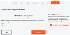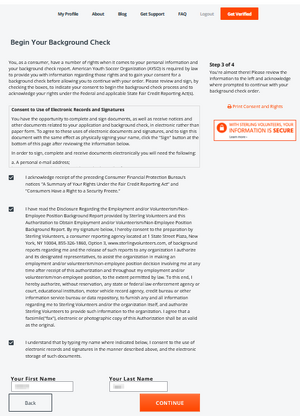 Now begin Step 1 of the 4-step background check by filling out the required information, matching what you entered on your volunteer application then, click Continue at the bottom of the page.