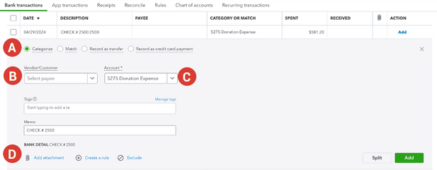• Categorize – This is used to add a new transaction to QuickBooks