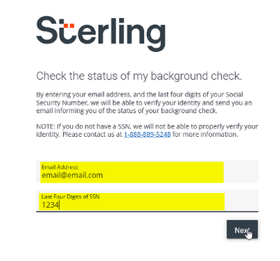3.     Next, you will need to fill in your email and the last four digits of your Social Security number, which you used to submit your background check.