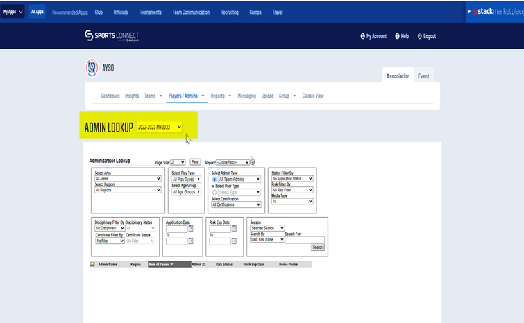 ADMIN LOOKUP - select the membership year