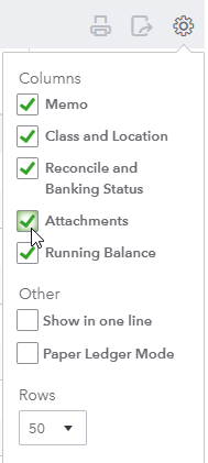 If you don't see a paperclip column, you can easily add it by selecting the gear icon above the running balance column on the far right File:Adding attachments1.png From the drop down, check the box next to "Attachments" and then click the gear to close your settings options.