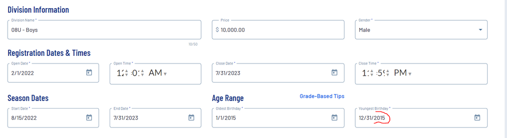 Having added or removed Age Divisions, you must edit the age ranges; example, edit 8U to include 6 & 7 year olds. For 8U through 16U, to create a two-year Age Division, increase the Youngest Birthday Year by 1 (e.g. - 12/31/2015 becomes 12/31/2016)