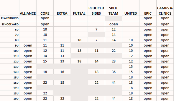 This chart represents the Age Divisions for each AYSO Play Type. The numbers are the maximum roster size that a team can be in order for it to be activated within the Association Platform. This maximum roster size may not be the same as the maximum roster size according to the AYSO Reference Book.