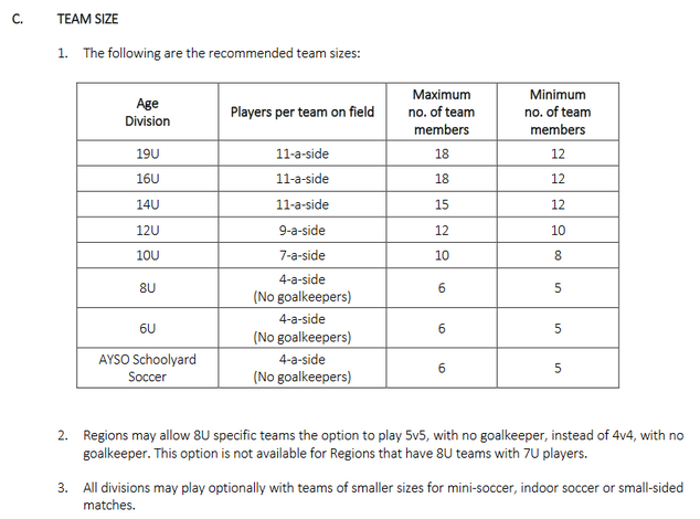 This is an image from the AYSO Reference Book that contains the maximum and minimum roster size for each age division.