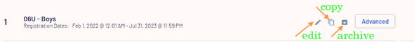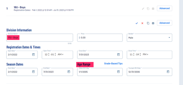 Before you complete Division Settings, edit any specific divisions where you want different dates, fees, etc by clicking the pencil to the right of the Division name.