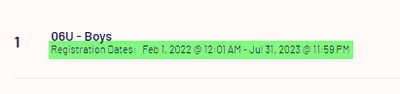 You can see the default Registration open and close dates under each Division - they currently default to Feb 1 2022 through July 31 2023. These are also the default Season open and close dates.