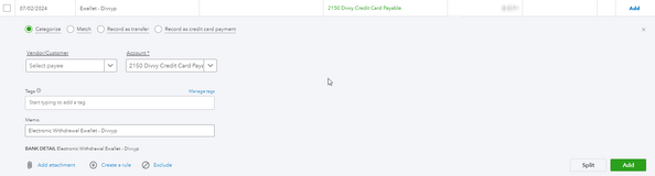 When the payment clears your bank, simply categorize the full payment to your 2150 Divvy Credit Card Account