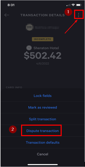- Click on three dots File:Divvy-dispute-1.png and select Dispute transaction.