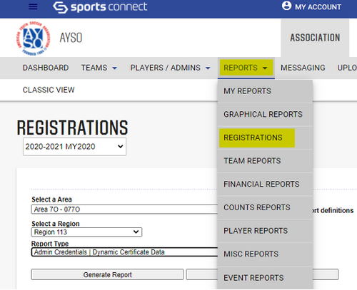 - Click on Reports then Registrations on the drop down menu.