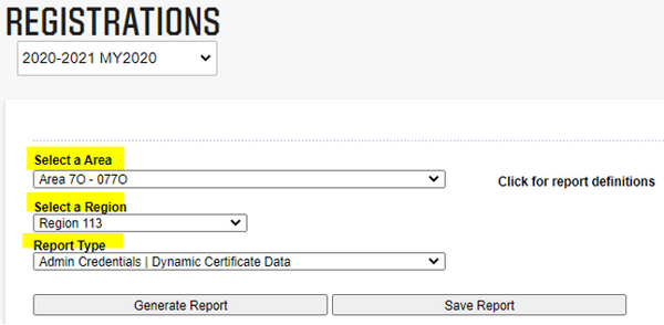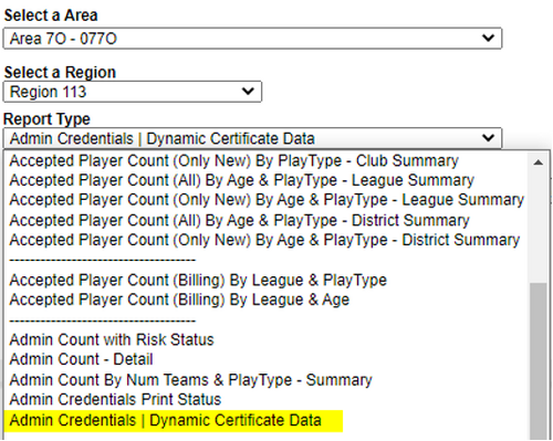 - Select your Area and Region if it was not automatically selected for you. Then select the Report Type: Admin Credentials | Dynamic Certificate Data.