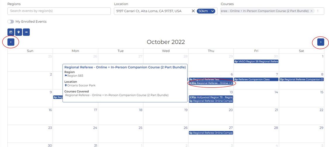 8. Use the arrows to change the calendar, then hover over the course to see details. Then click the course you want to register/attend.