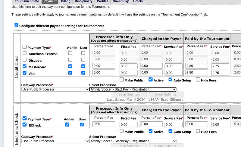The Stack Tournament module can process both credit cards and e-checks as part of registration. The registrar can also manually process payments (in the event of accepting cash, checks, or other form of payments).