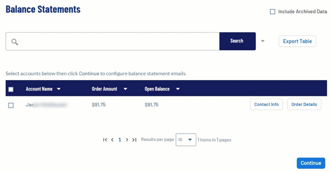 Click the box next to any orders that you want to send the statement to, then click Continue.