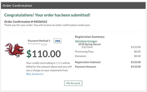 7. After you submit your order, you will be brought to a Order Confirmation page. You will also receive a confirmation email, detailing your registration.