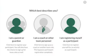1. If this is your first time registering on the site, you will see a pop up, asking you to describe what fits you best. In most cases, you will select the first option if you have a child you are trying to register. The middle option is if you are volunteering but DO NOT have a child participating on the site. The third option is if you are trying to register yourself for an activity.