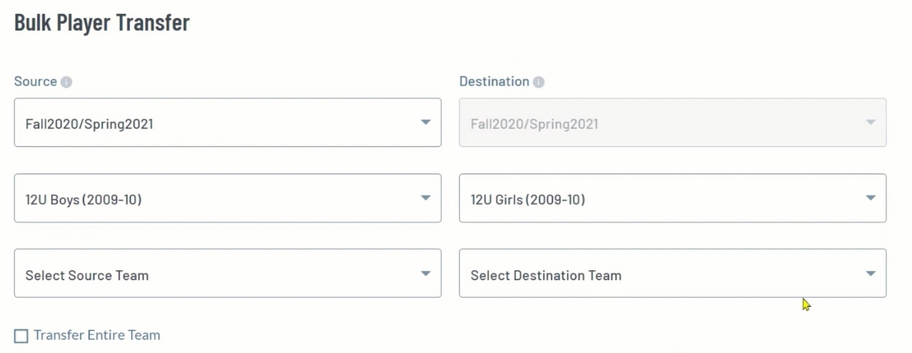 If you need to move many players from one division to another, for example moving all boy players to a coed division, you can do that with the bulk transfer tool.
