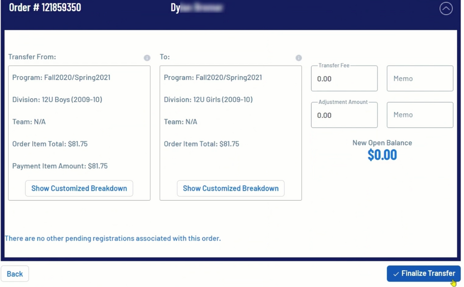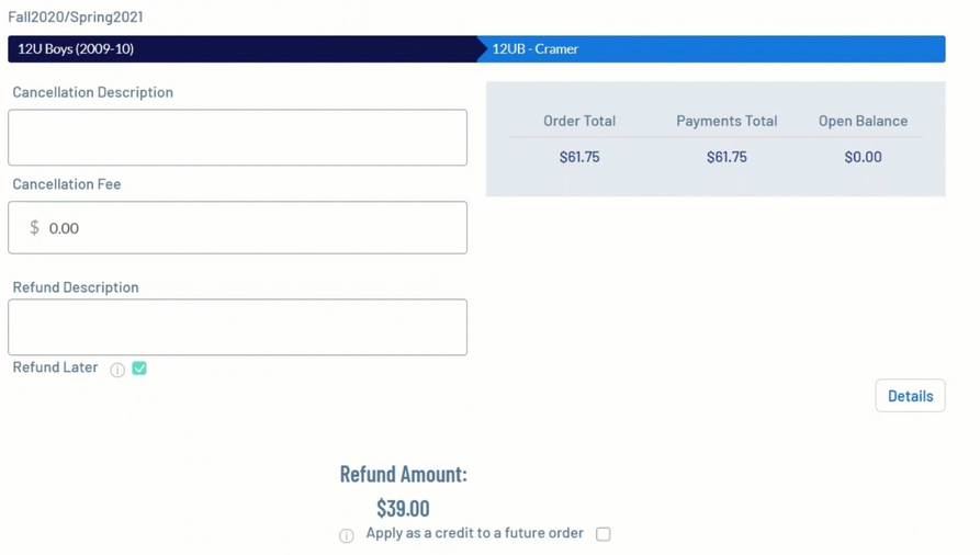 Box Checked: You'll be able to issue a refund in Sports Connect after you cancel the registration. The order will be pending and have a credit balance. You'll be able to issue a Credit Card or check refund.