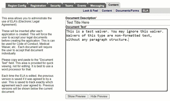 Click the Show Preview button to see what your waiver will look like. When you're ready, click the Registration ELA box, then click Add Document.