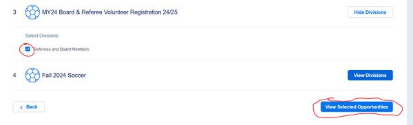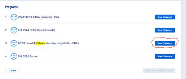 b) If your Region creates a separate program for Referees, scroll down and click “Show All Available Opportunities”.  Find the program that includes Referees (e.g. “MY24 Board & Referee Volunteer Registration 24/25), click View Divisions, check the division that includes Referees, scroll down and click “View Selected Opportunities”