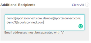 4. To manually add additional email addresses (email addresses not already in the system), type or paste the emails into the Additional Recipients field. If you are adding more than one email address, they must be separated by a semicolon (;). See Email External Members for help on how to do this in an excel file.