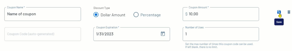 Fill out the coupon information. You must have an expiration date. If you leave the Number of Uses blank the coupon code can be used an unlimited number of times before it expires. The Coupon Code will be auto generated. Don't forget to click the save icon.
