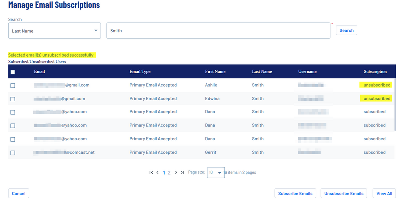 6. After clicking the ‘Unsubscribe Emails’ button, the subscription status will change and there will be a message that the volunteers were successfully unsubscribed.