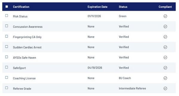 The fourth requirement is Sudden Cardiac Arrest. You can find this training in AYSOU under the Safehaven category and is currently referred to as “Simon’s Heart”. Your status will update automatically one to two hours after you complete the training, so there is no need to upload a certificate.