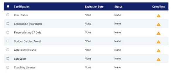 Example of a new volunteer profile with no certifications completed.