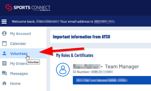 1. To upload your certificates, log into your Sports Connect account where you registered as a volunteer (your Region's website).