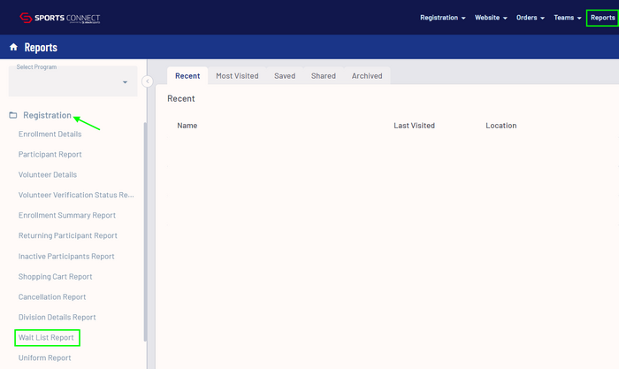 If you make the decision to limit your registration and turn on waitlists, be sure to run your reporting weekly to determine if you should create additional teams. To access the Waitlist Report go to Reports>Registration>Wait List Report